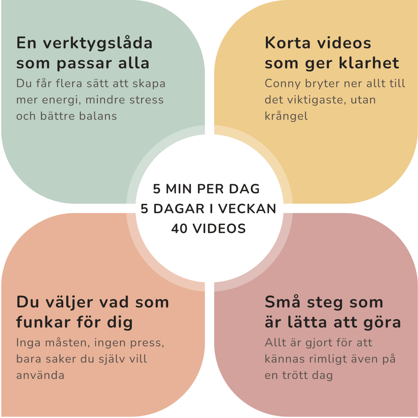 Det är inte mängden information som gör skillnad, utan små steg du faktiskt orkar ta. Därför är varje video runt 5 minuter och innehåller konkreta verktyg som du kan använda direkt i vardagen – precis det som hjälpt våra deltagare att få resultat.